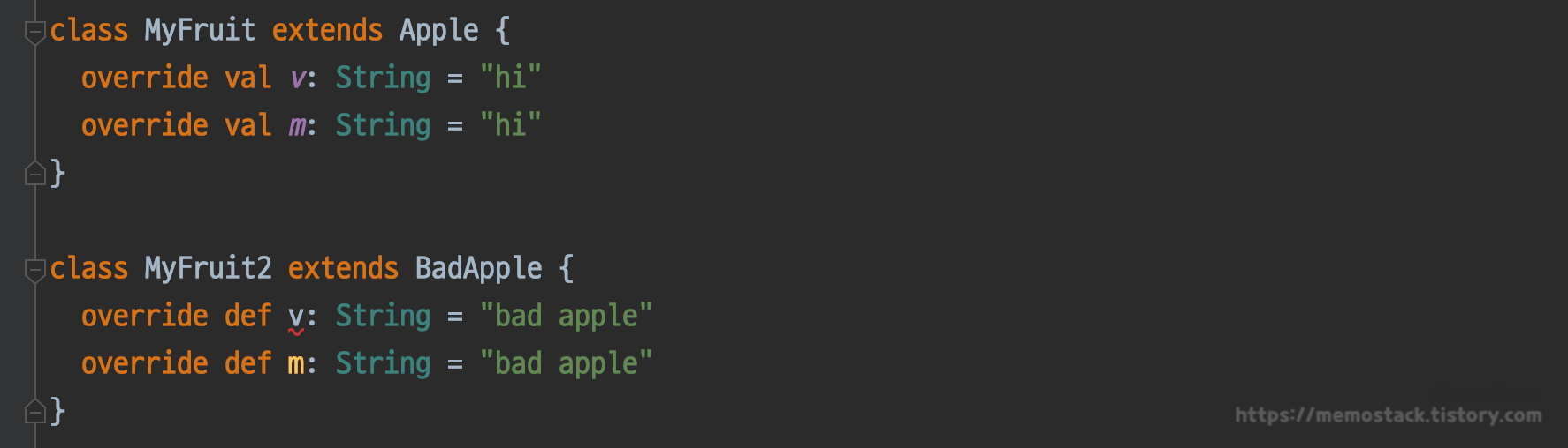 override def v: String // 오류. val 은 def 로 오버라이드 할 수 없다.