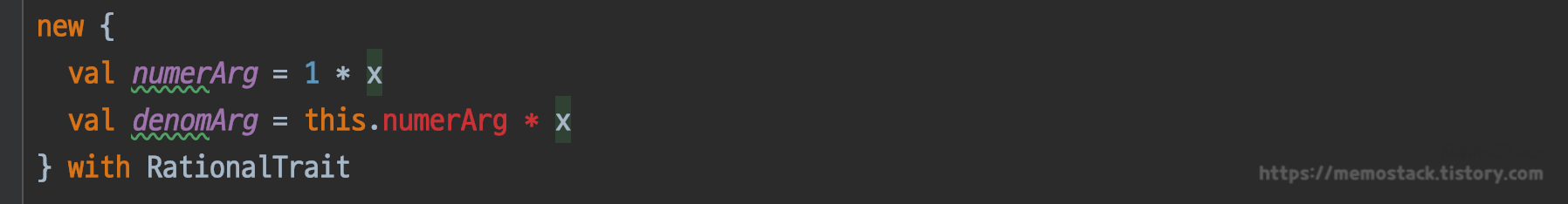 만약 위 Rational 이 트레이트(Trait) 가 아닌 클래스였다면, new Rational(expr1, expr2) 와 같이 구현할 수 있다.