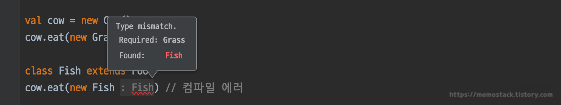 type키워드와<: Food를 이용해서,Food를 상속받는 서브클래스 타입이라는 것을 명시해준다.Grass는Food의 서브클래스이다.Cow에서type을 이용해서Grass가Food의 서브클래스라는 것을 명시한다.eat메소드를 오버라이드(override) 할 수 있다.