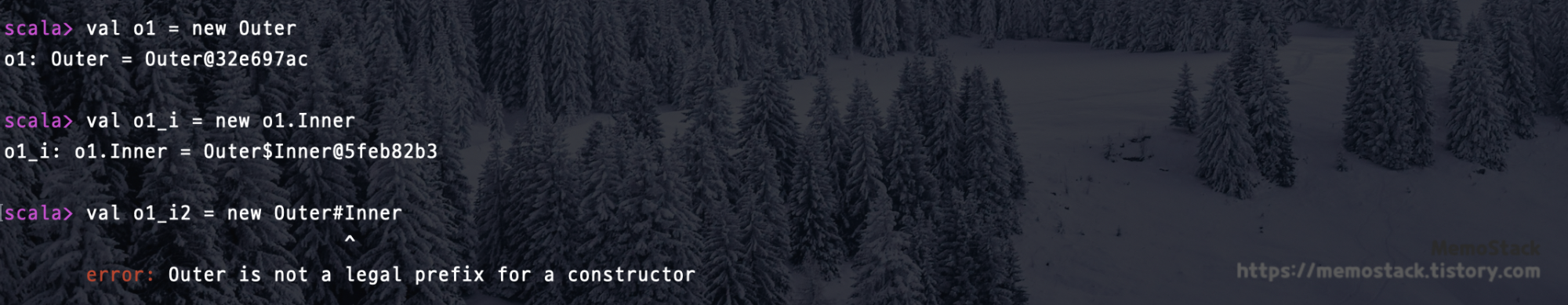 val o1_i2 = new Outer#Inner // 오류. 외부 인스턴스 없이 Inner 클래스에 접근할 수 없다.