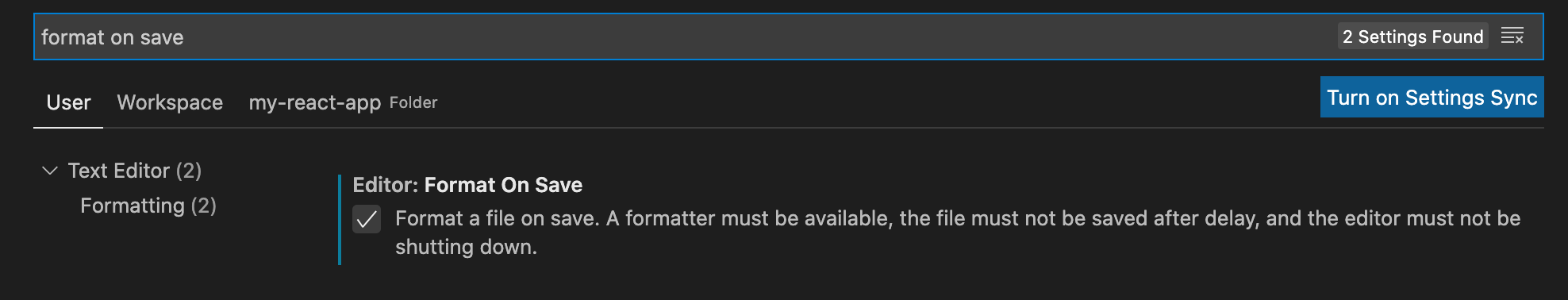 - format on save: 저장 키를 눌렀을때, 자동으로 포맷팅을 해줌