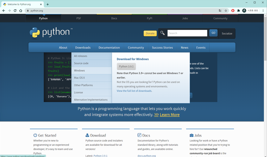 Python을 사용하려면 설치를 먼저 해야하기 때문에, 우선 설치부터 진행해본다. Python3 설치 파일 다운로드 파이썬을 설치하는 방법은 여러가지 방법이 있다. (본 글에서는 파이썬 공식 페이지에서