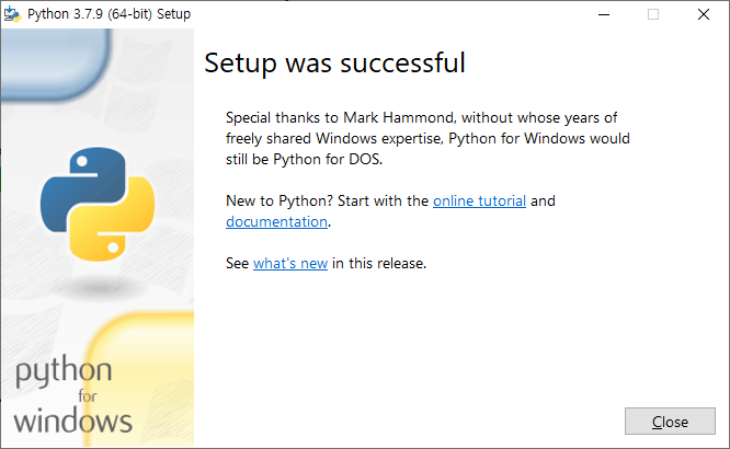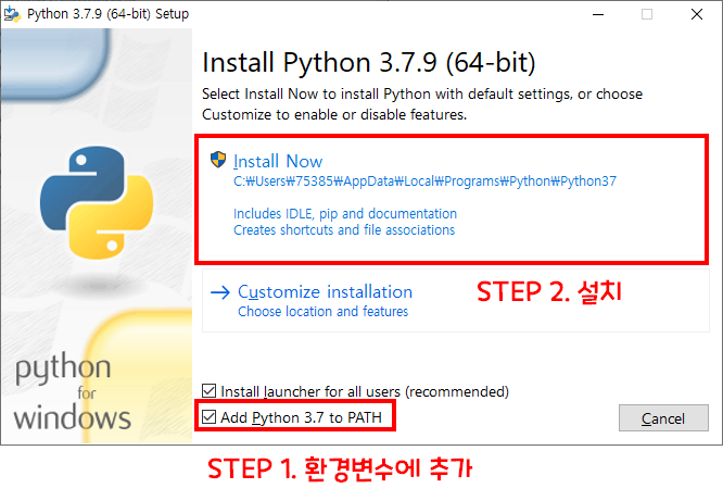인스톨러 설치 완료 후 실행하여 파이썬을 설치합니다.
