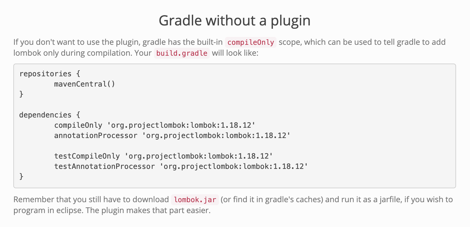 롬복(lombok) 사이트에 gradle 환경에서 dependency를 추가하는 방법이 소개되어 있다.