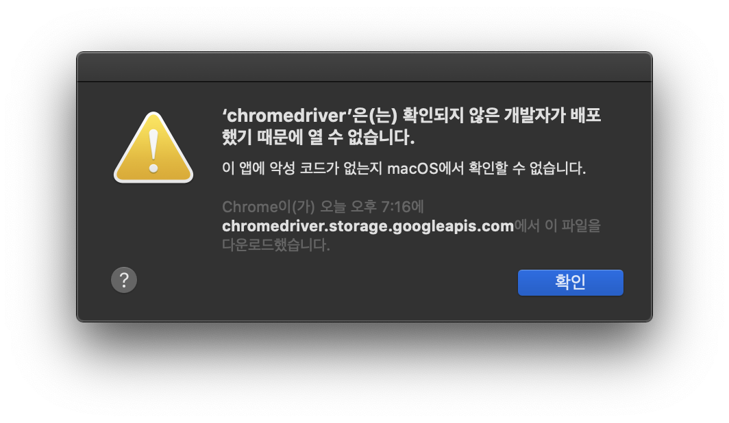 웹 크롤링을 만드려고 하니, chromedriver를 열 수 없어서 구글링하여 열 수 있는 방법을 찾아봤다.