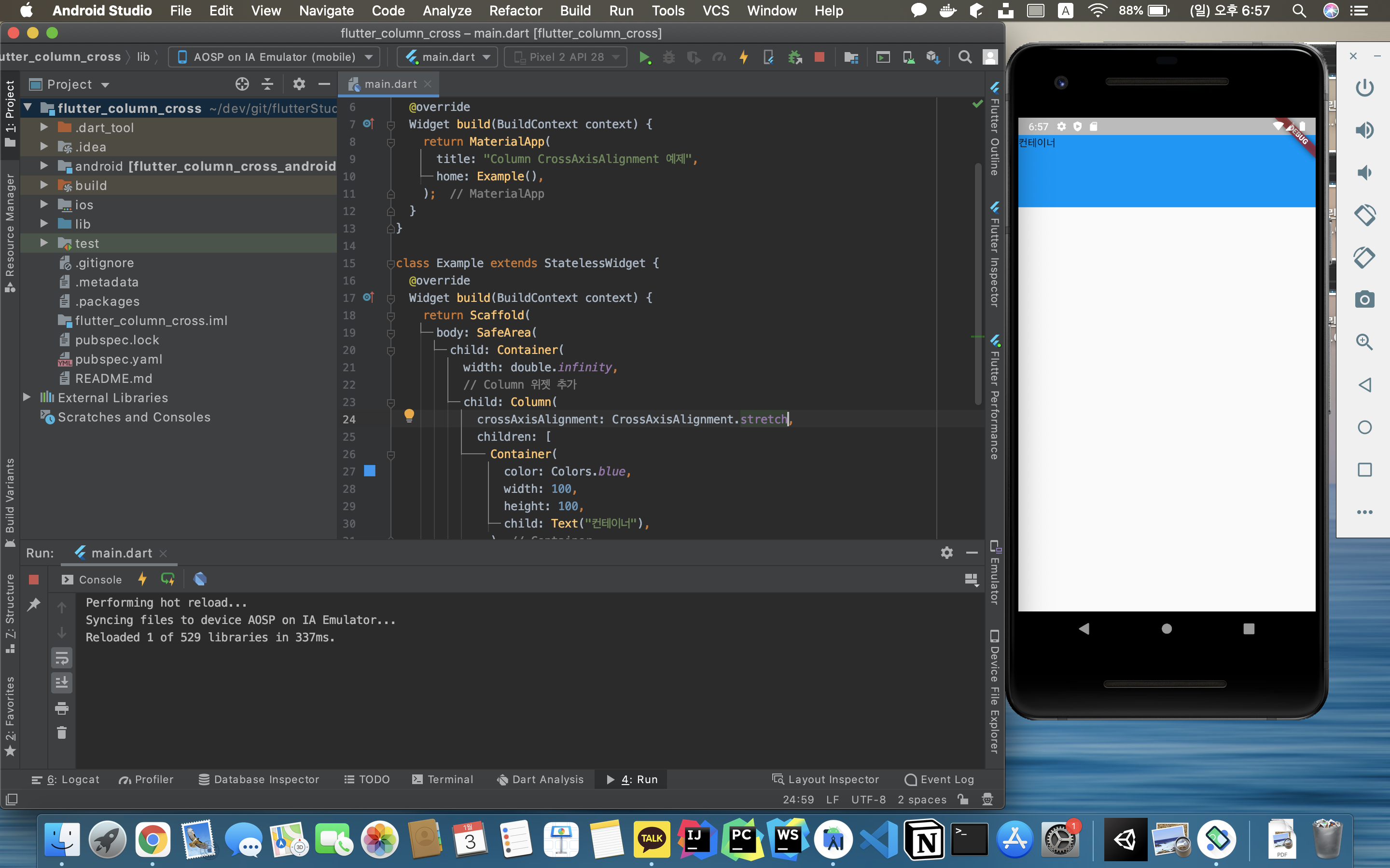 Column 위젯을 가로로 정렬할때는 crossAxisAlignment 속성을 이용한다.