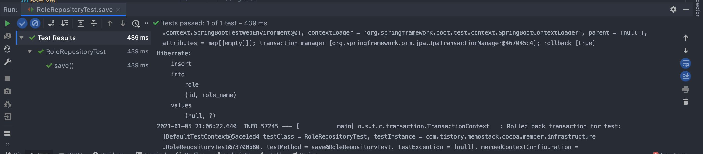 junit5에서는 @RunWith 대신에@ExtendWith(SpringExtend.class)을 사용한다.@DataJpaTest어노이테이션을 사용하면, JPA 관련된 Component만 로드 된다.- 덤으로, 테스트 종료 후 롤백도 같이 수행하여, 테스트할때 들어간 값에 대해 걱정할 필요없다.