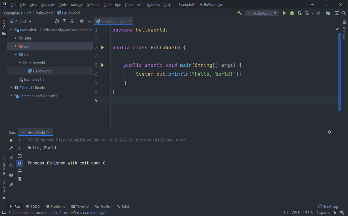 Java에서는 콘솔을 출력할 때System.out.println()메소드를 사용한다.- 문자열을 표현할 때는 쌍 따옴표("")를 사용한다.