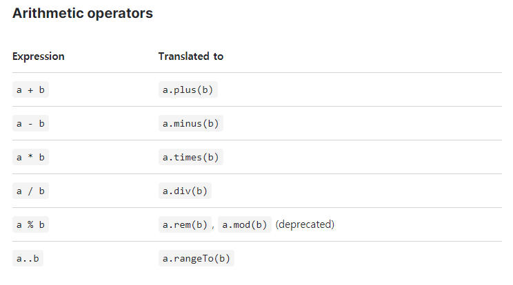 operator fun 예약어와 plus(), minus(), times(), div() 등 의 메소드를 이용하여 +, -, *, / 를 정의할 수 있다