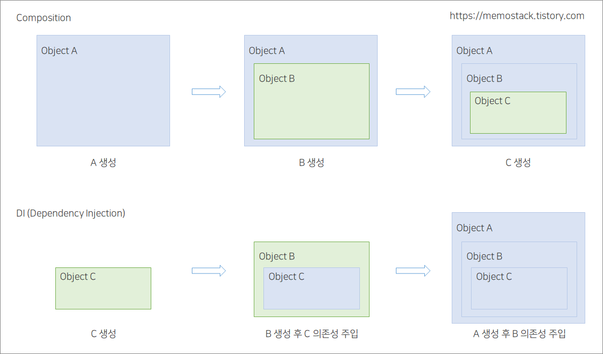 DI의 경우는 C 생성 -> B 생성 -> A 생성 한다.