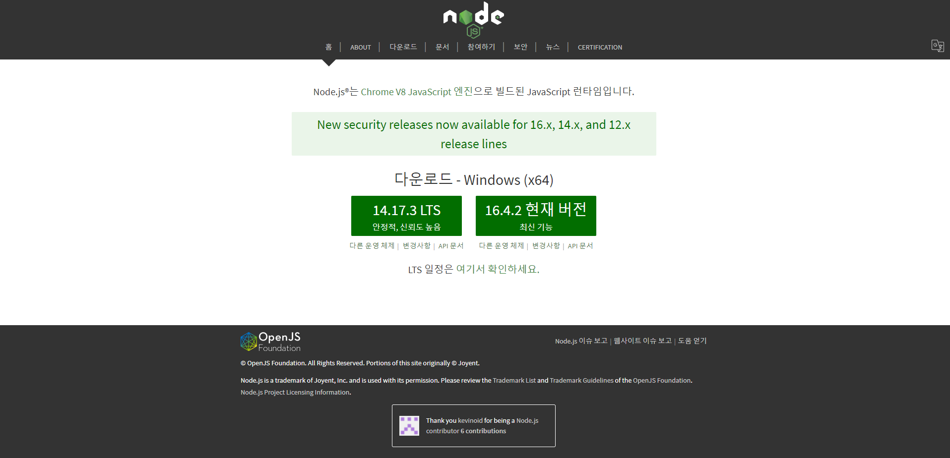 2021.07.08 기준으로 LTS 버전은 14.17.3이다. 본 글에서는 14.17.3을 다운로드 받는다.