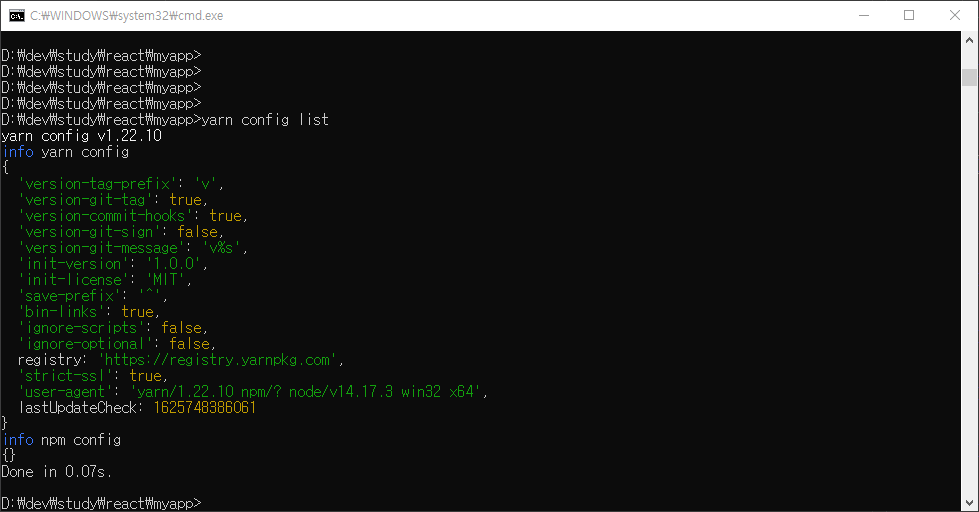 그리고, 다시 yarn config list 명령어로 제대로 바뀌었는지 확인해 본다.