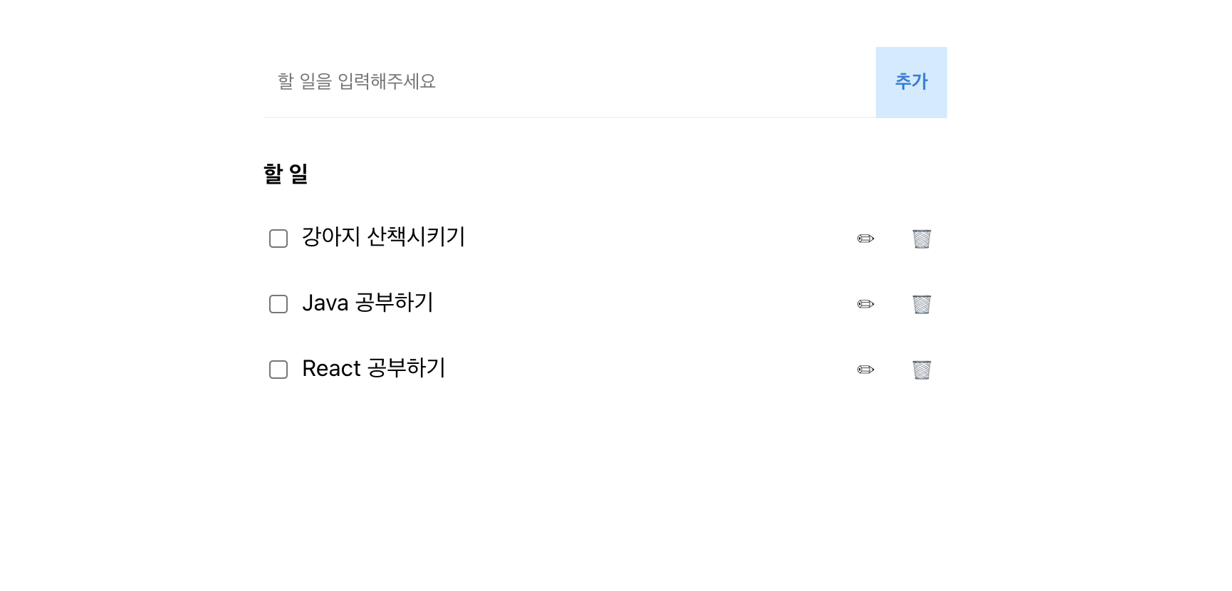 input에 '할 일'을 입력하고 '추가' 버튼을 눌러보면 아래와 같이 목록이 화면에 나타난다.