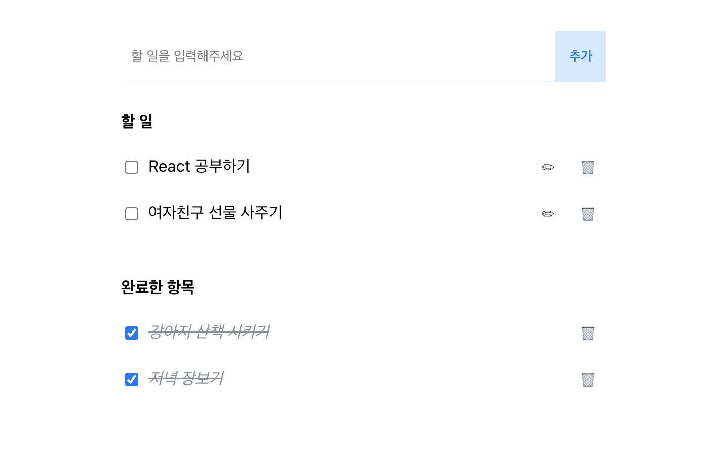 완료한 일은 색상과 폰트 스타일, 취소선을 넣어서 완료한 느낌(?)이 풍기도록 스타일을 입힌다.
