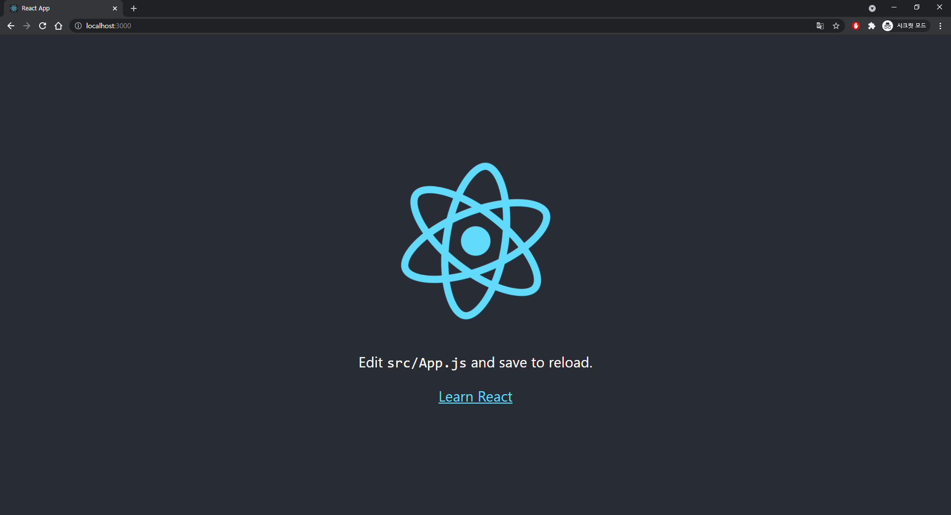 아래 사진과 같이 방금 만든 React 프로젝트가 호스팅되어, 브라우저 화면에 나타나는것을 확인 할 수 있다.