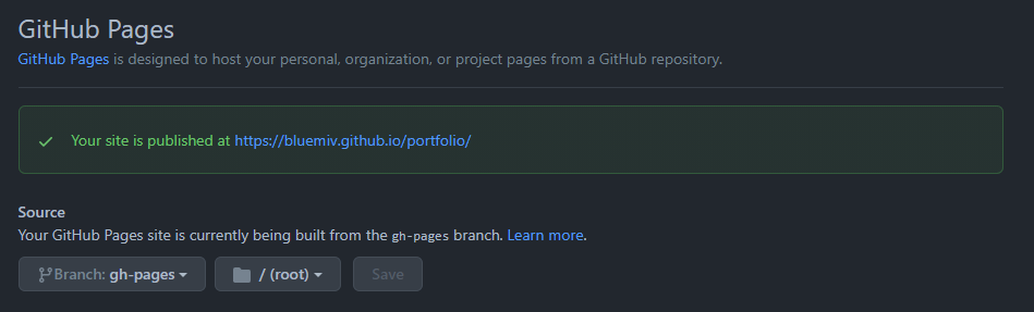 아래와 같이 gh-pages 브랜치로 설정하면, 호스팅이 완료된다.