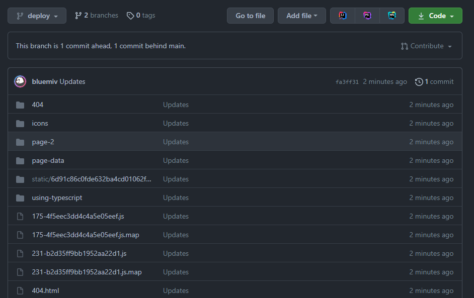 github 저장소로 가서 deploy 브랜치에 정적 파일들이 push 됐는지 확인해보자