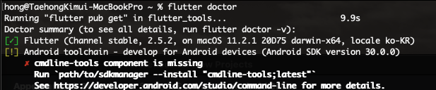 제대로 설치가 되었는지 flutter doctor 명령어로 확인하는 도중 아래와 같이 Android 쪽에 환경 설정이 덜 된것을 확인했다.