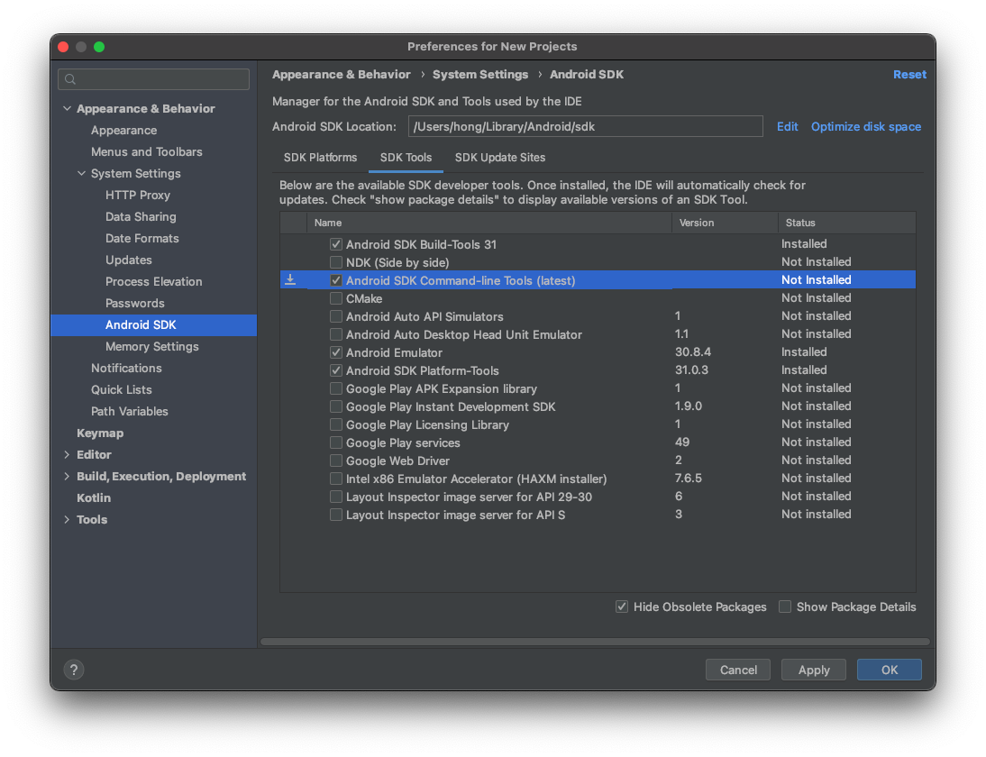 탭에 SDK Tools 를 클릭하고 Android SDK Command-line Tools (latest) 를 체크하여 apply를 누르고 설치한다.