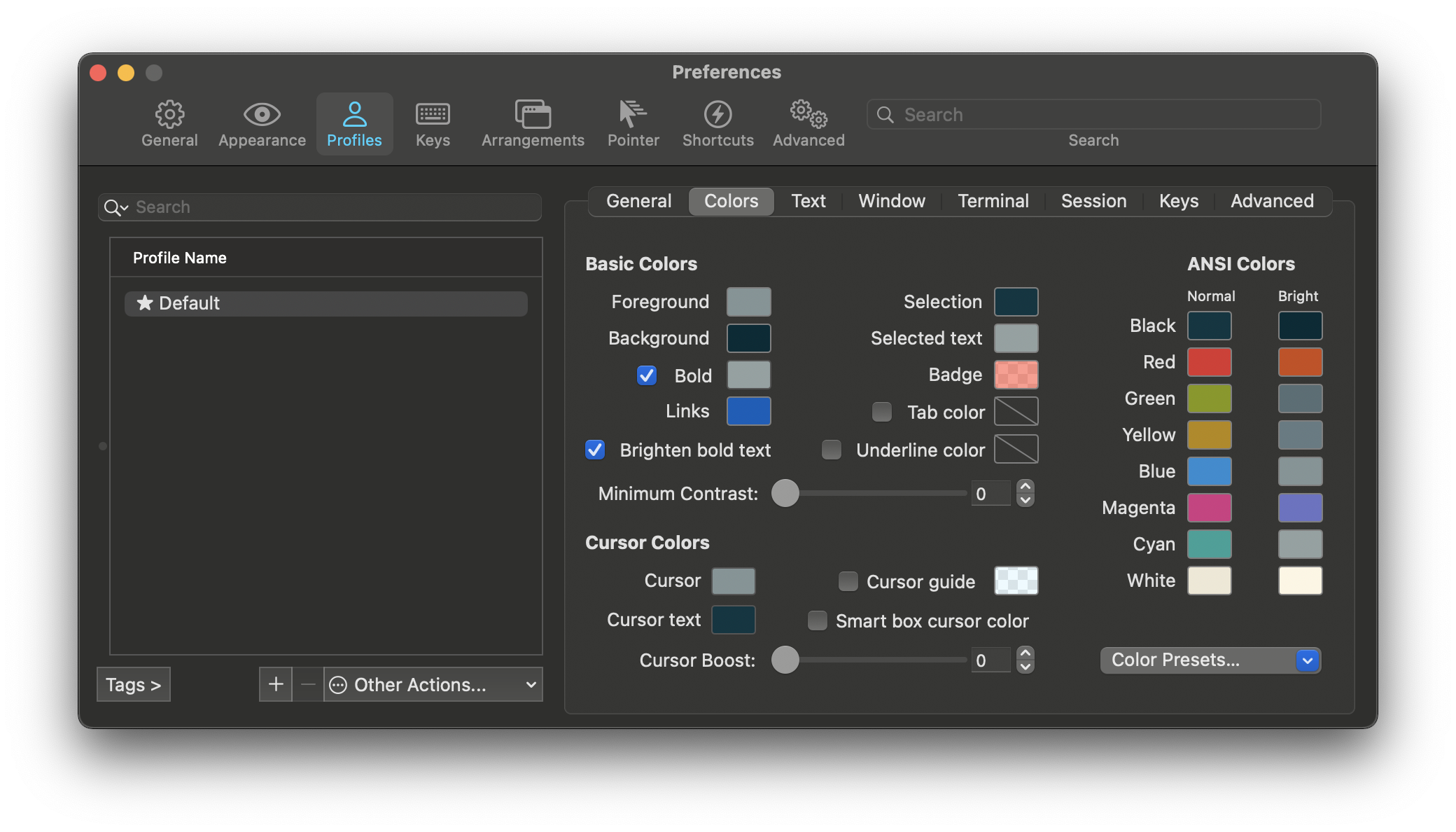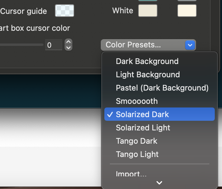 - Preferences > Profiles > Colors > 원하는 Color Presets 설정