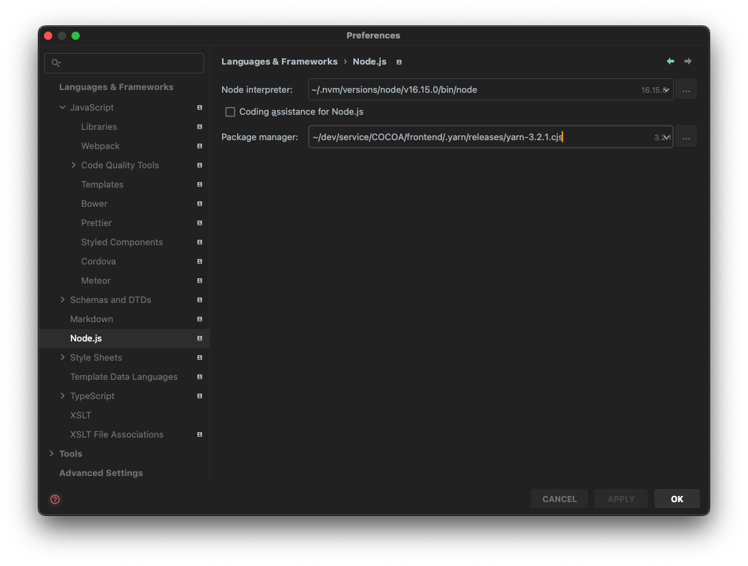 2. Languages & Frameworks > Node.js 클릭
