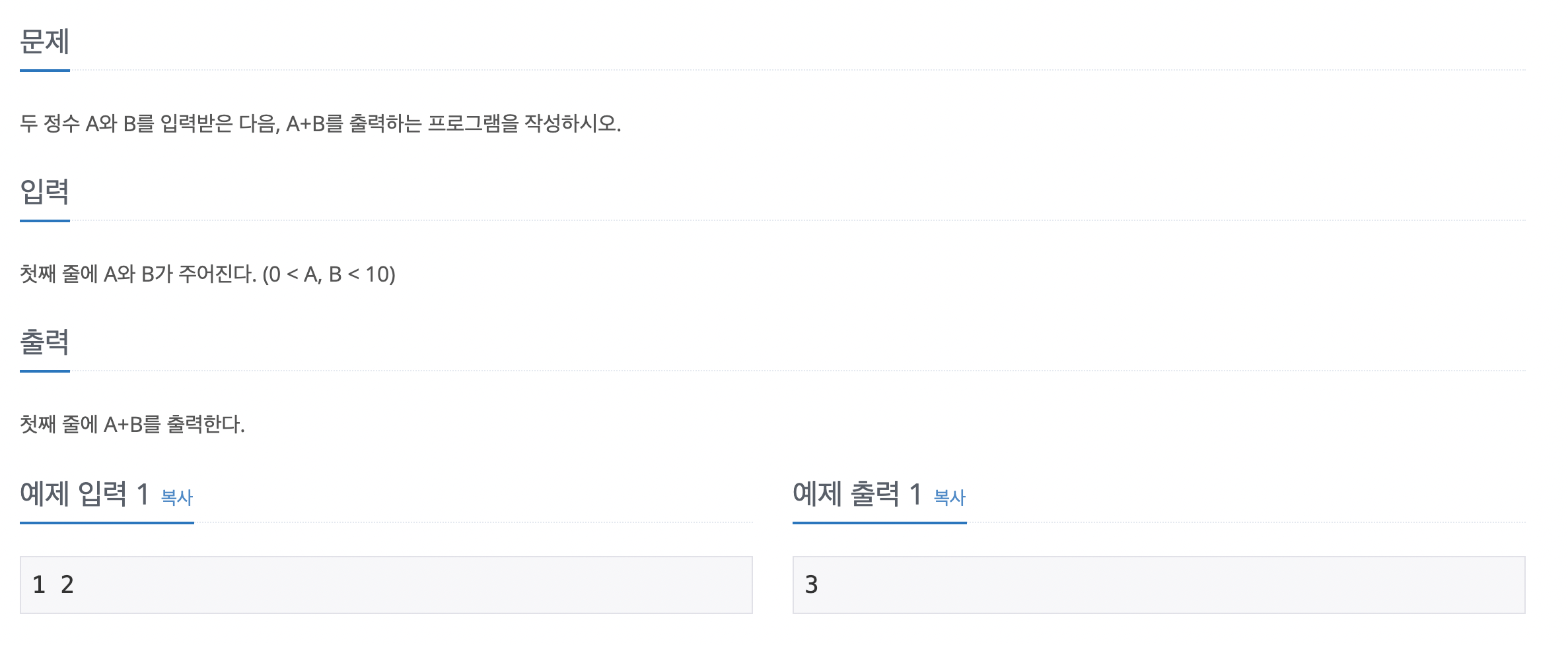 문제는 상당히 쉬운 문제로, 단순히 2개의 숫자를 입력받아서 더한 값을 콘솔 출력하는 문제이다. (프로그래밍 입문자가 문법을 익힐겸 풀기엔 좋은것 같음)