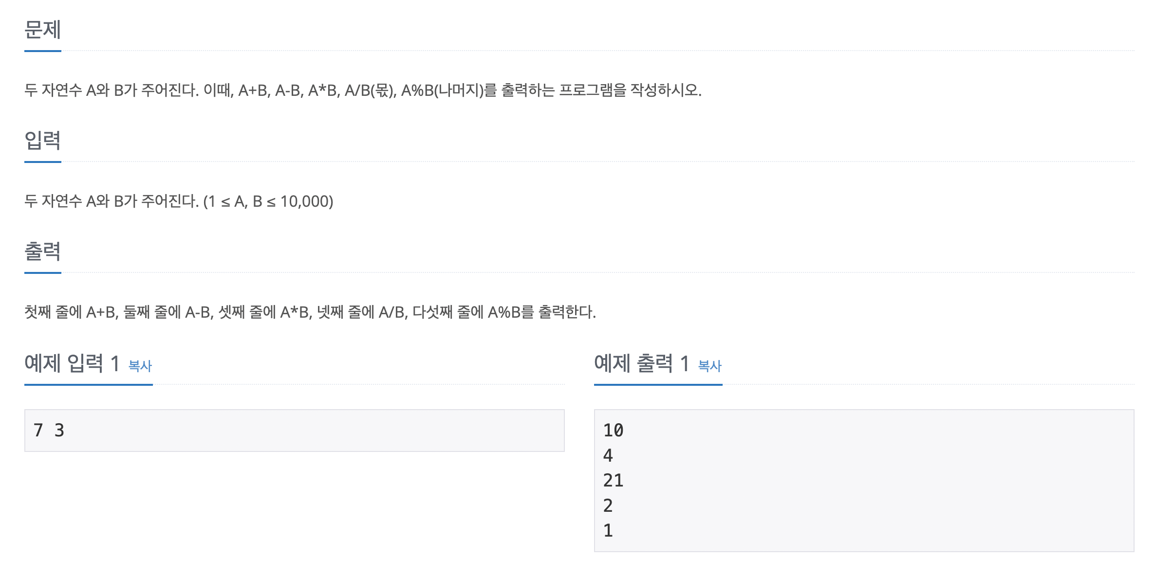 2개의 숫자를 입력받아, 사칙연산 값과 나머지 연산 값을 출력하면 되는 문제이다. 주의할 점은 나눗셈을 한 뒤에 몫만 출력해야하기 때문에 정수값으로 파싱해주는 작업을 해야한다. (솔직히 한번 틀림)