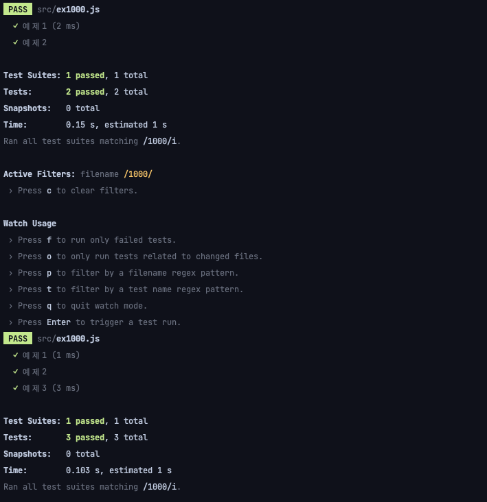 yarn test 명령어를 계속 수행하기 귀찮다면, 아래와 같이 test:watch를 수행하면 된다. (파일에 변화가 생길때마다 테스트를 수행하게 됨)