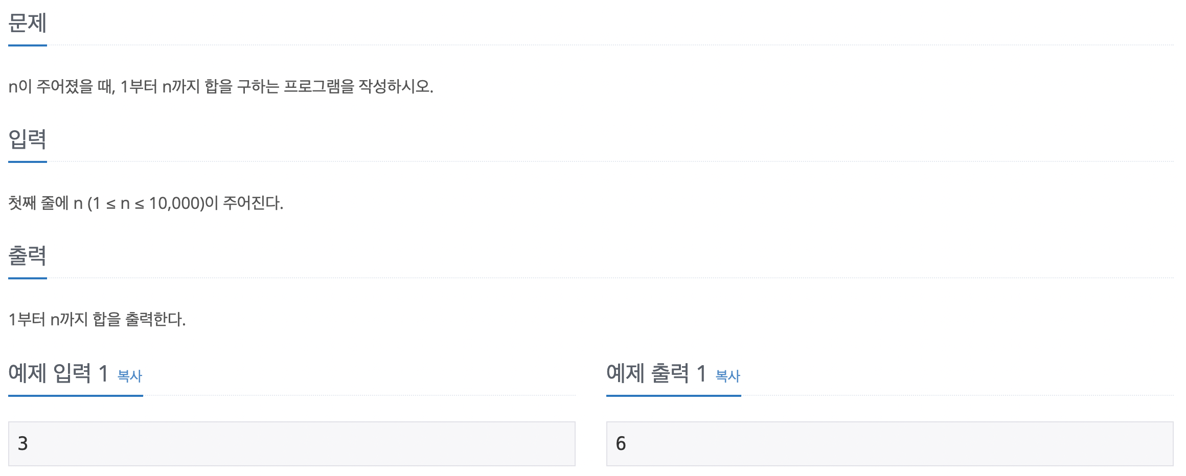 단순히 1 부터 입력받은 값까지 더하는 문제로 한번의 loop를 통해 문제를 풀 수 있다