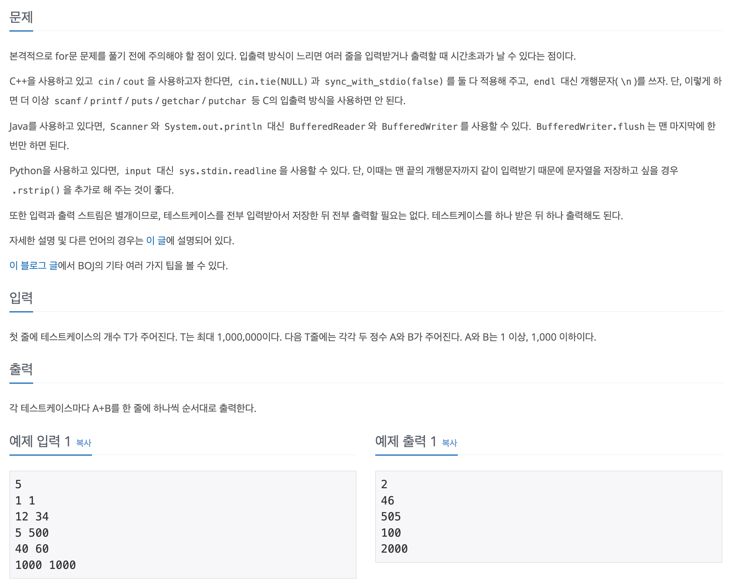 아래 문제와 같이 단순히 입력 받아서 더한 값을 출력해주면 된다.