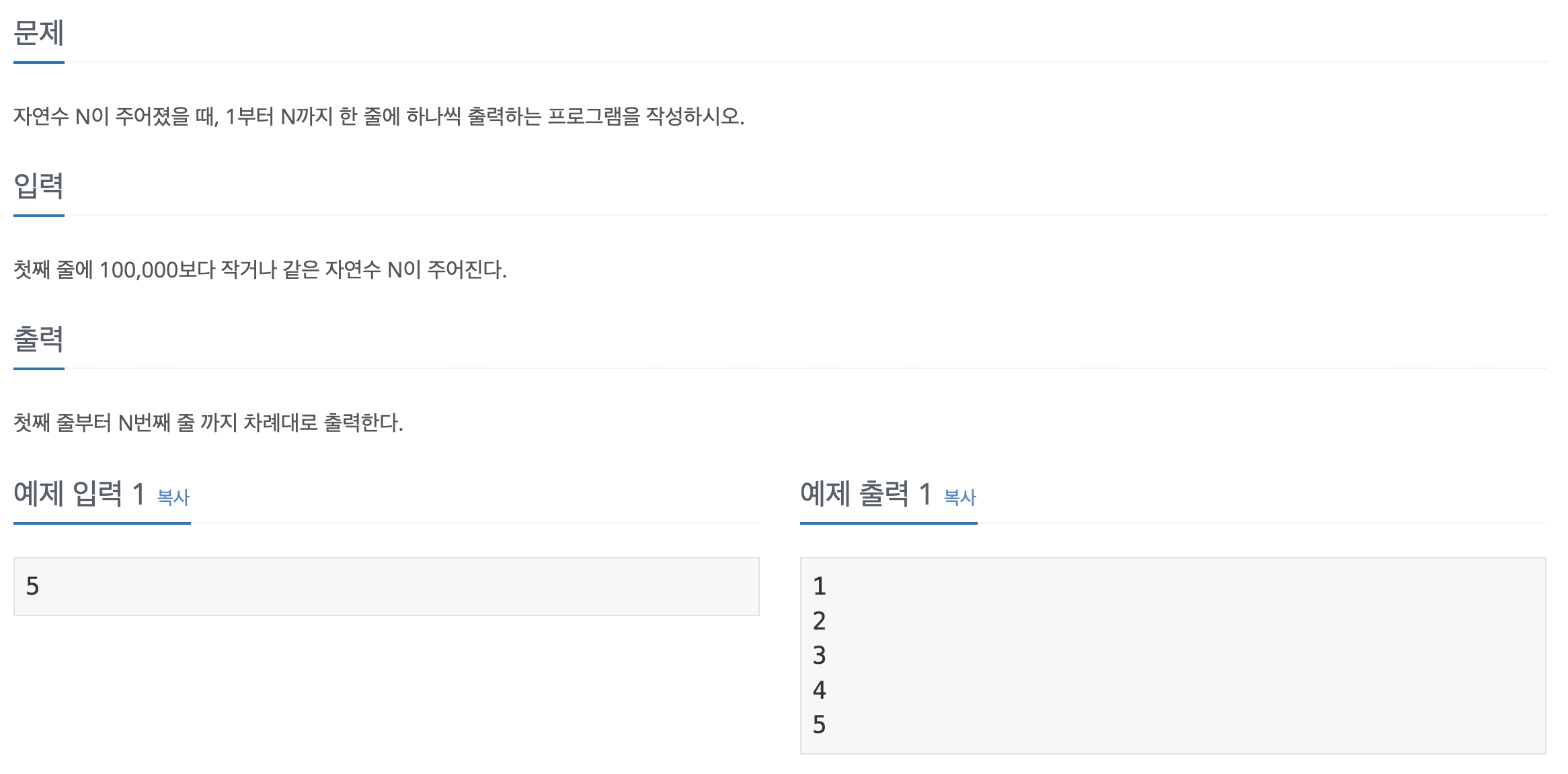 1부터 입력값까지 개행하여 출력주면 되는 간단한 문제이다.