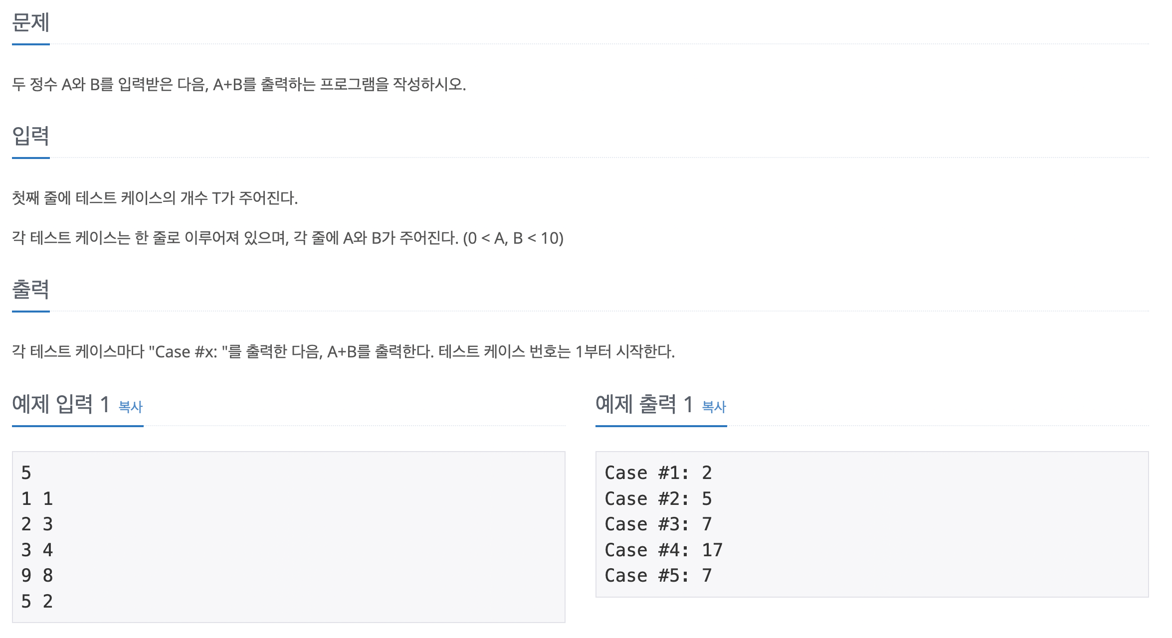 입력 받은 두 값을 더한 뒤에 Case#1: 2 형태에 맞게 출력해주면 되는 간단한 문제이다.