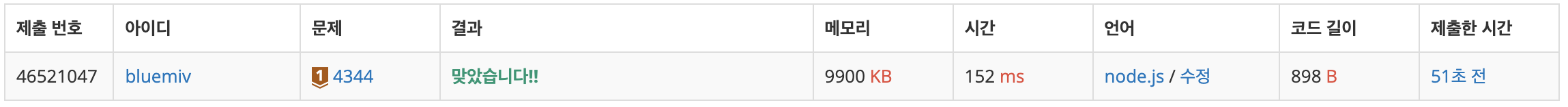 | 백준 3052번 / 나머지 (nodejs 알고리즘 풀이) (0) | 2022.08.11 |