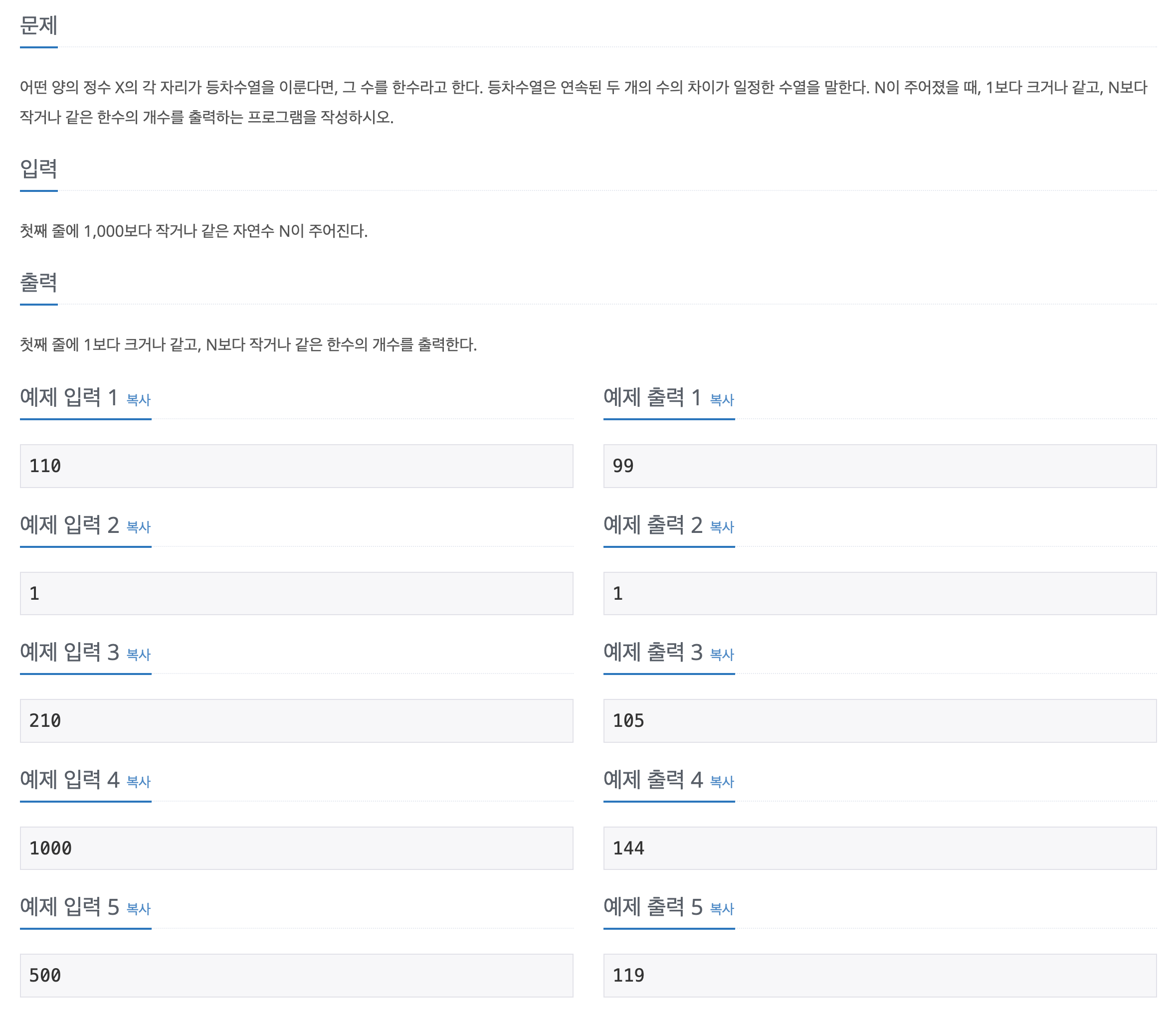 1부터 주어진 숫자까지 iteration 하면서 "한수"의 개수를 구한다.