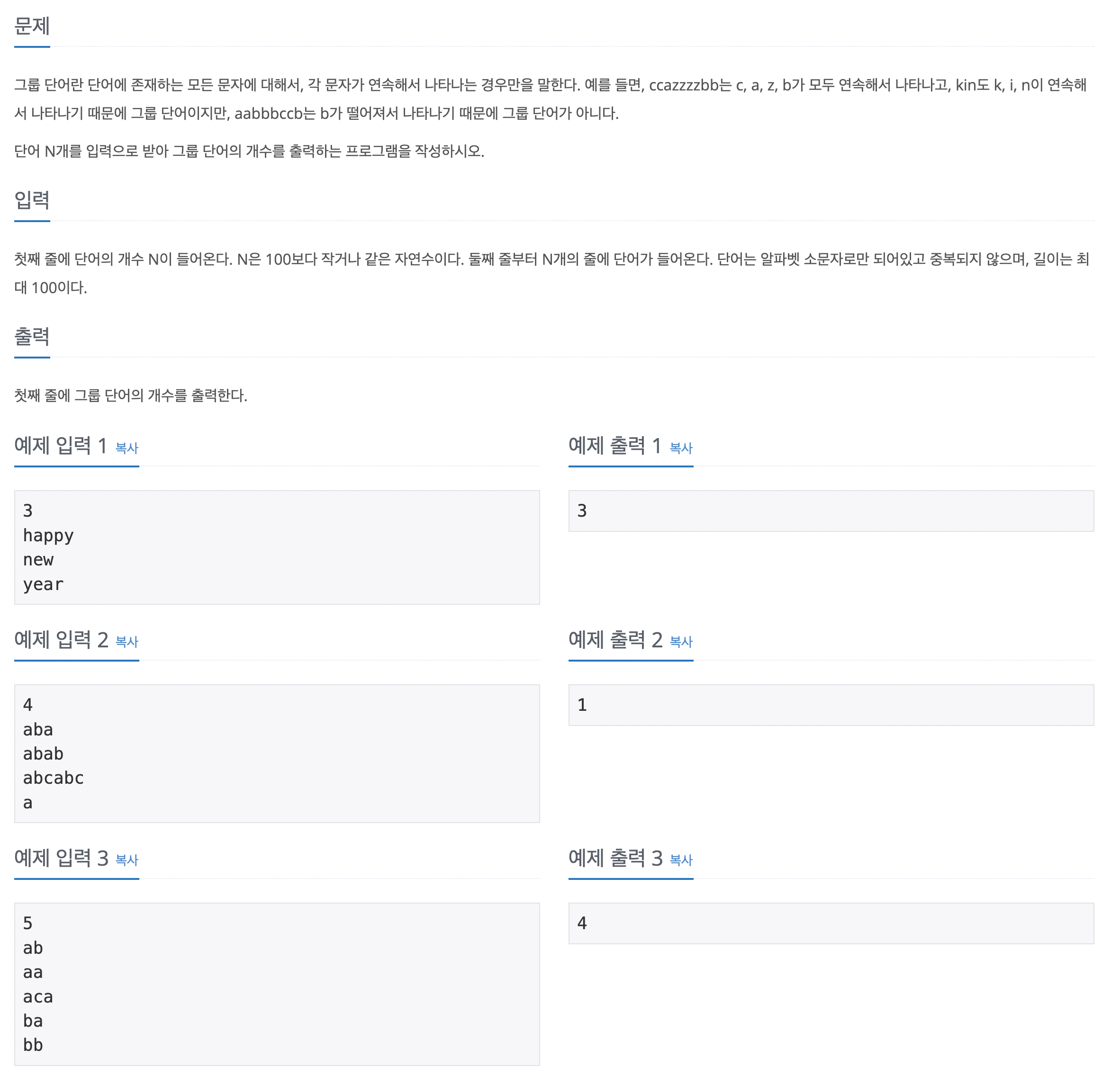 이미 한번 나온적이 있는 영문자이고, 이전 값과 다른 경우(연속하지 않은 경우) 그룹 단어가 아니다. 예를들어,