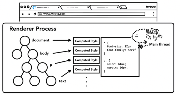 CSS에서 페이지 Element의 스타일을 지정할 수 있기 때문에 DOM이 있는 것만으로는 페이지가 어떻게 생겼는지 알 수 없습니다. 메인 스레드는 CSS를 구문 분석하고 각 DOM 노드에 대해 계산된 스타일을 결정합니다.