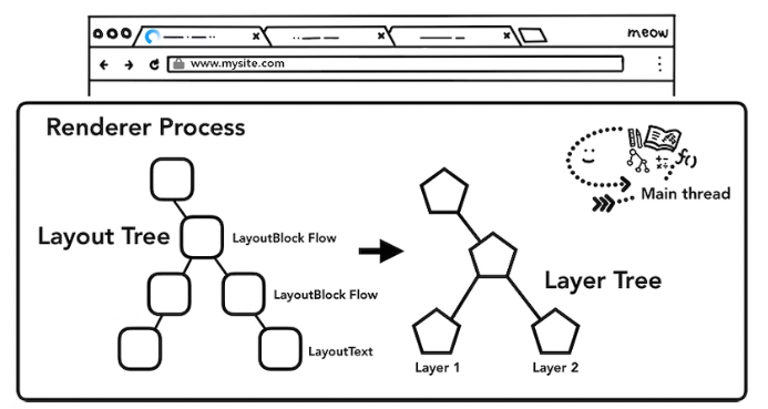 어떤 Elemenet가 어떤 레이어에 있어야 하는지 알아보기 위해, 메인 스레드는 layout tree를 통해 레이어 트리를 만듭니다(이 부분은 DevTools 성능 패널에서 "레이어 트리 업데이트"라고 함).