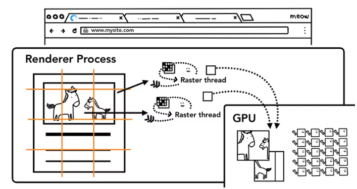 레이어 트리가 생성되고 페인트 순서가 결정되면 메인 스레드는 해당 정보를 compositor thread에 커밋합니다. 그런 다음 compositor thread는 각 레이어를 raster합니다. 레이어는 페이지의 전체 길이만큼 클 수 있으므로, compositor thread는 레이어를 타일로 나누고 각 타일을 raster thread로 보냅니다. raster thread는 각 타일을 raster하고 GPU 메모리에 저장합니다.