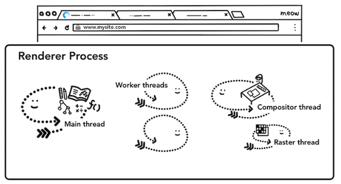 web worker 또는 service work를 사용하는 경우, JavaScript의 일부가 work의 thread에 의해 처리됩니다. compositor 및 raster thread는 Renderer Process 내부에서 실행되어, 페이지를 효율적이고 원활하게 렌더링합니다.