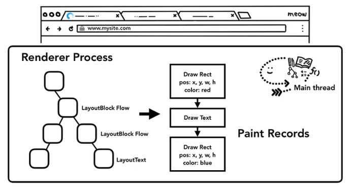 이 페인트 단계에서 메인 스레드는 layout tree를 생성하고, paint records를 생성합니다. 페인트 기록은 "배경을 먼저 그린 다음 텍스트를 그린 다음 직사각형"과 같은 페인팅 과정에 대한 메모를 남깁니다.