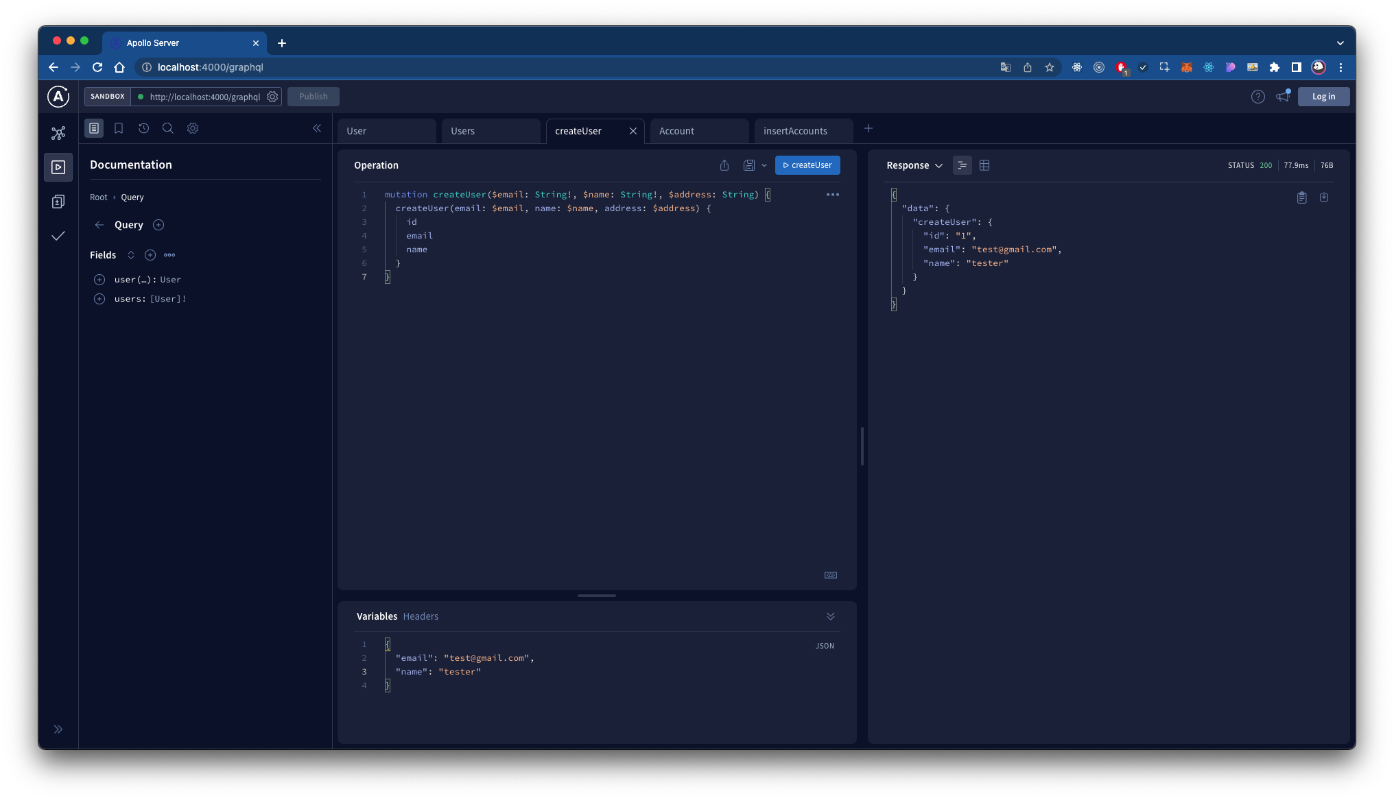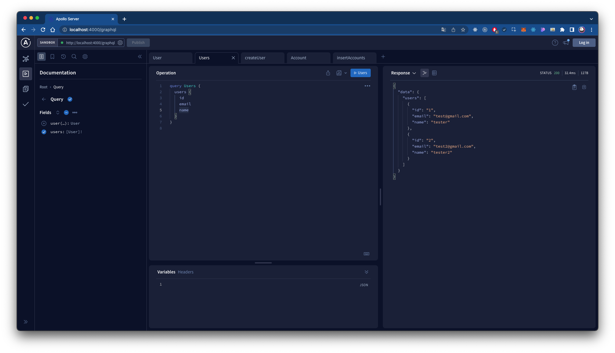 이제 방금 만든 메소드를 이용하여 리졸버를 통해 user를 생성하거나 조회할 수 있다. 이제 필요없는 mockData 를 삭제하고, user, users, createUser 리졸버를 정의한다.