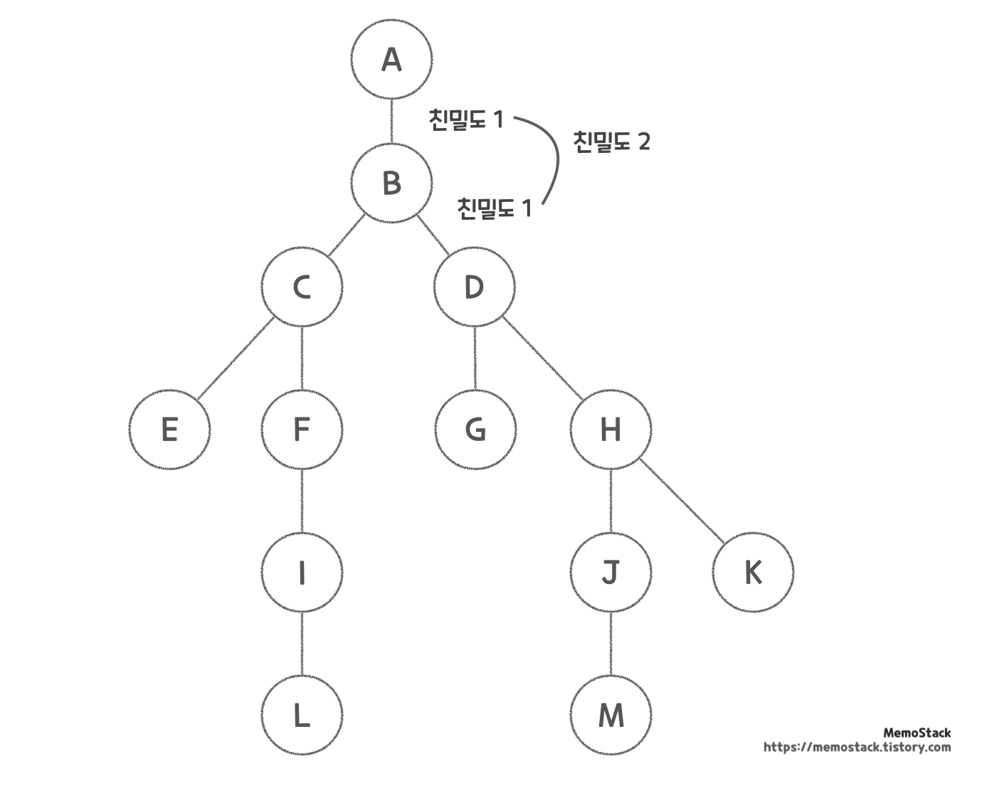 예를들어, 사람과 사람 사이의 친밀도를 1 이라 한다. A ~ M 까지 사람이 있을때, A를 기준으로 각각의 사람들과의 친밀도를 구한다.