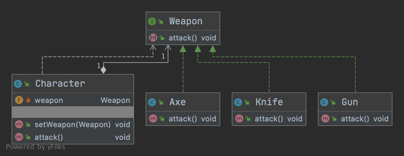 attack()이란 메소드를 만들고, 구현 내용은weapon에게 위임(deligate)한다.- waepon.attack();