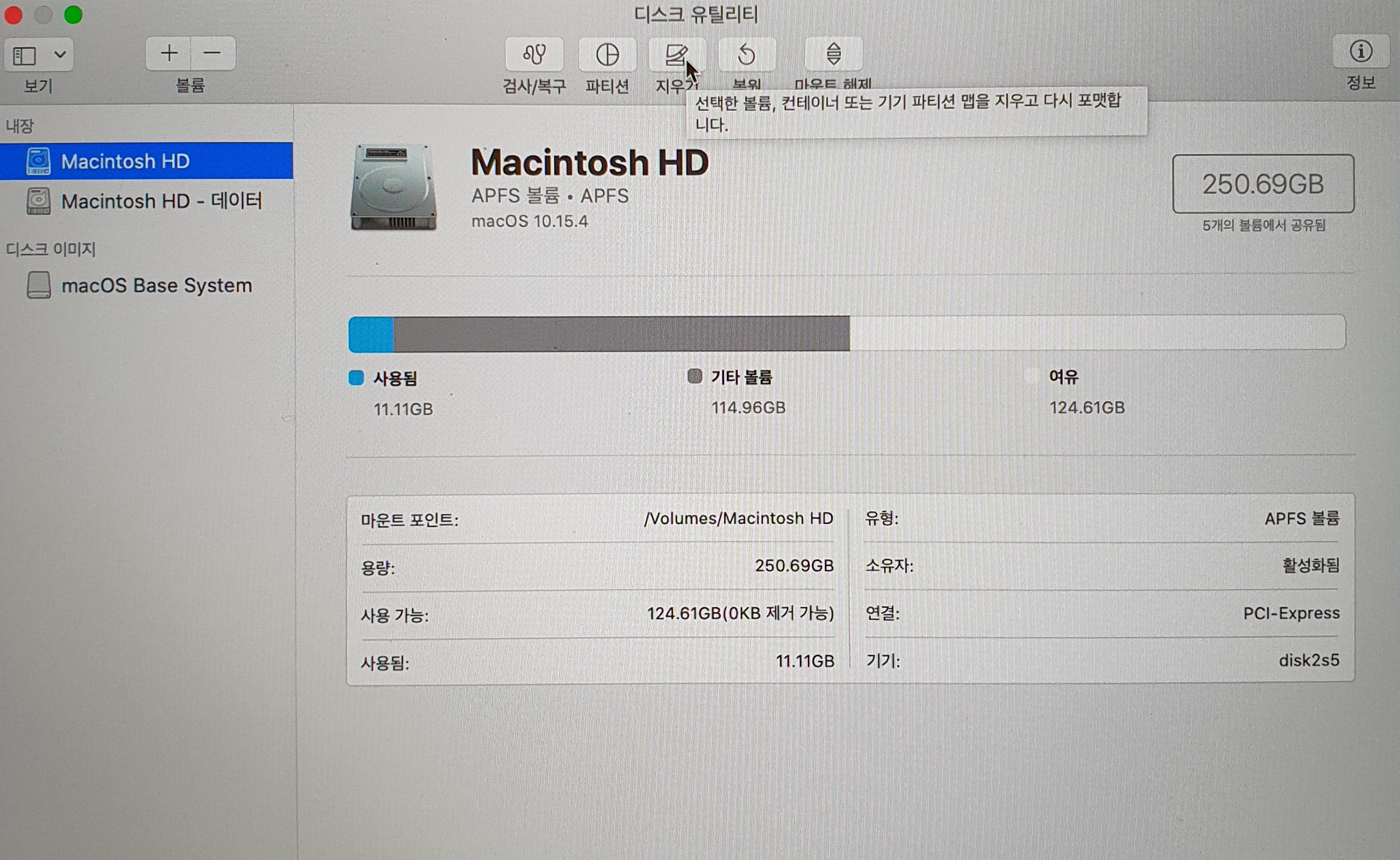 3. 지우려는 디스크를 선택하고 '지우기'를 누른다.
