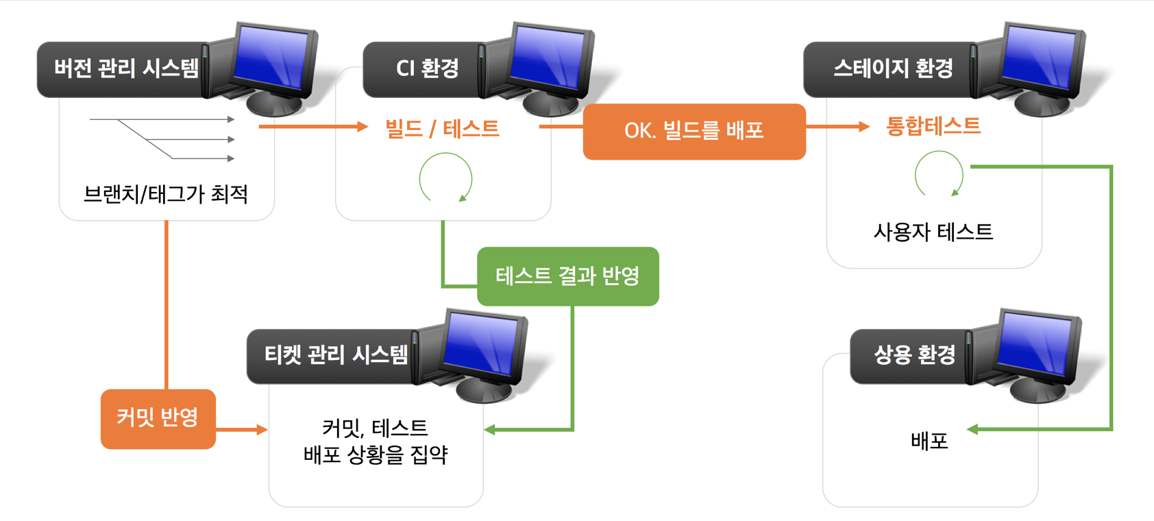 - 정기적으로 짧은 시간에 빌드하고 테스트, 병합하는 것을 뜻한다