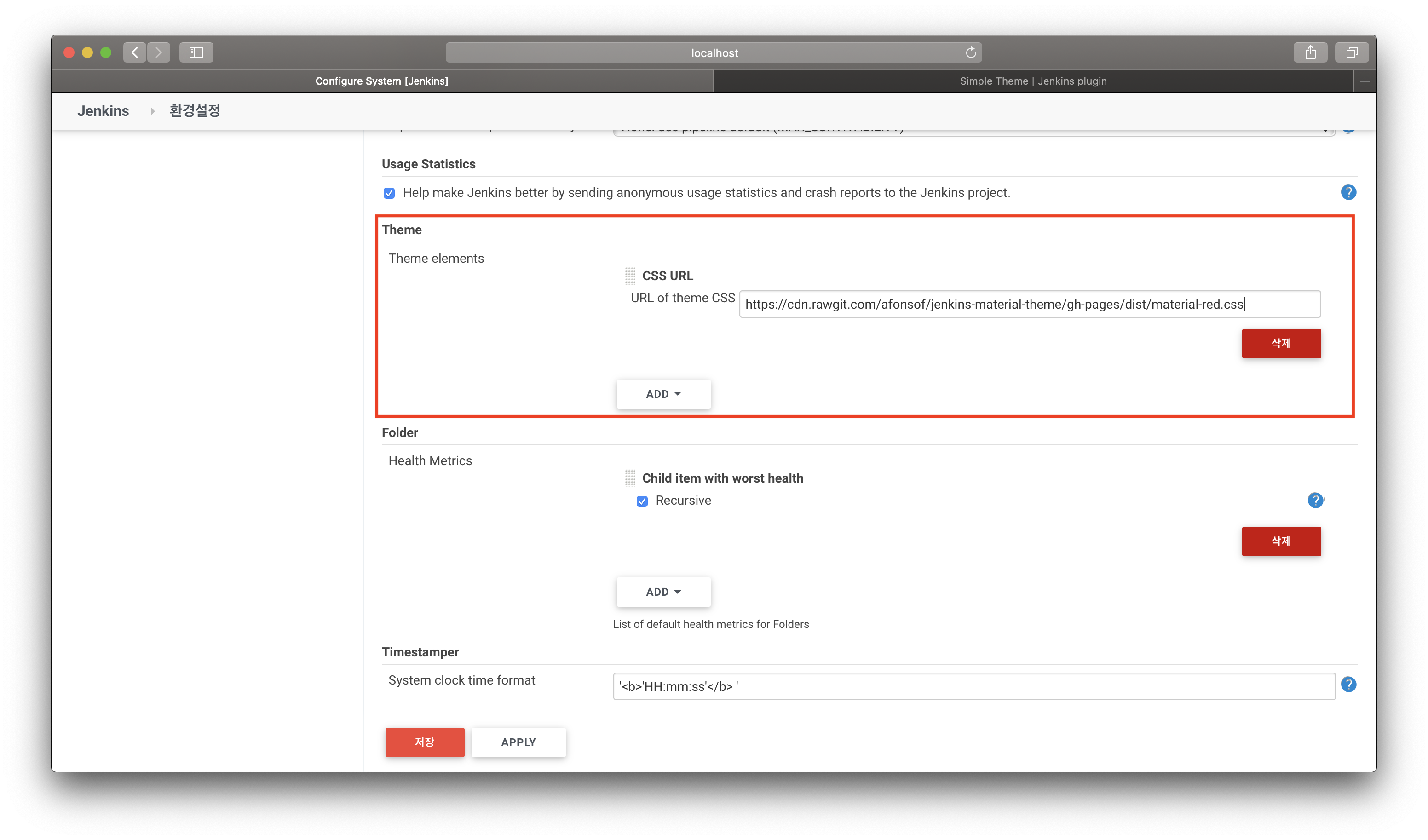 - 테마 CSS URL 정보는 http://afonsof.com/jenkins-material-theme/ 를 참고한다.
