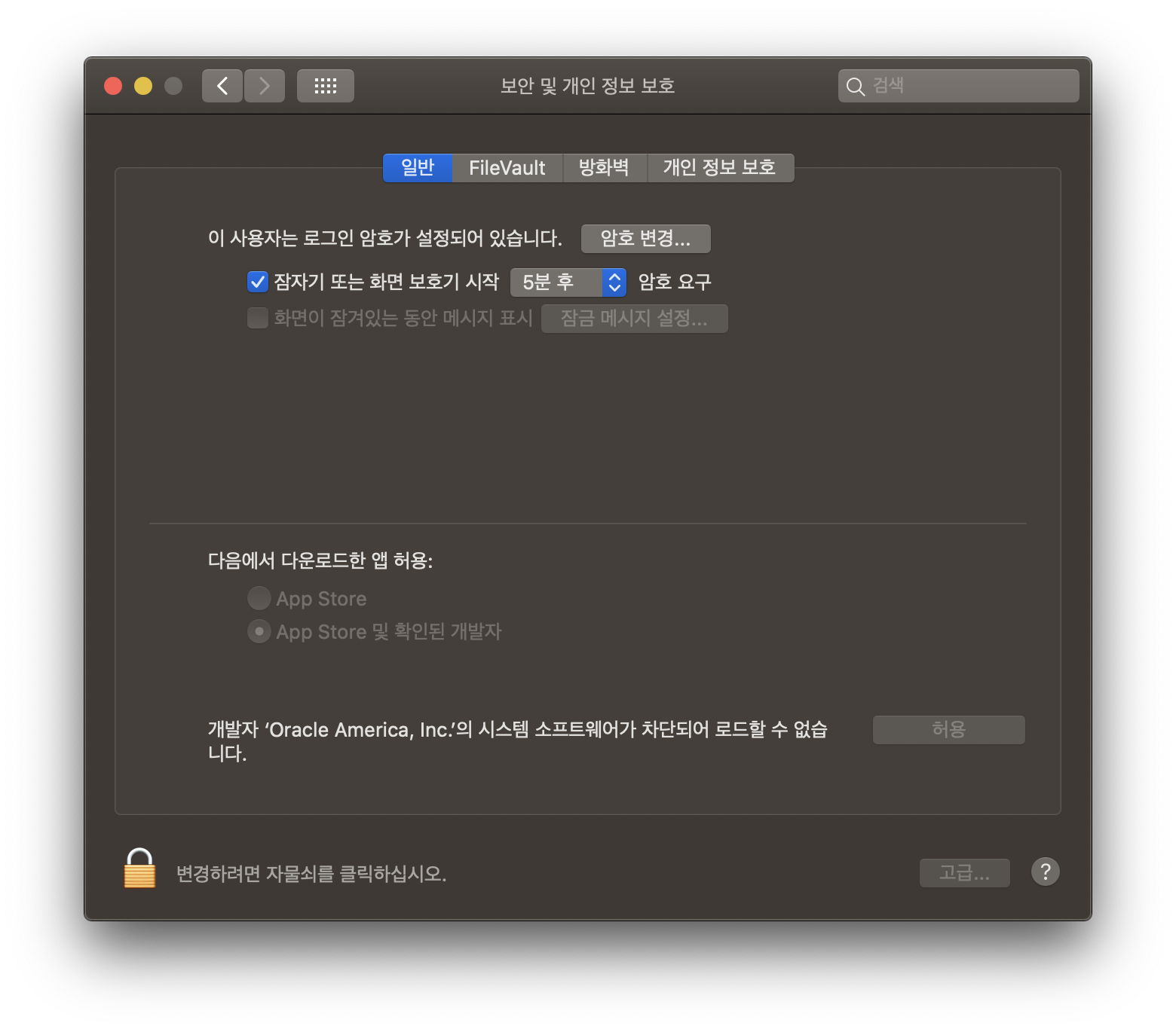- '시스템 환경 설정' > '보안 및 개인 정보 보호' > 하단의 자물쇠 클릭